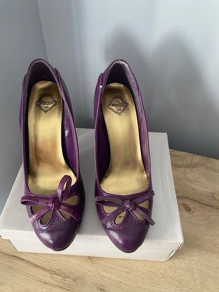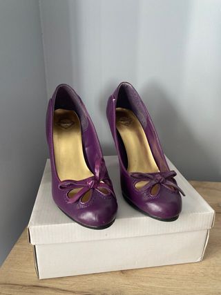 Elegantes zapatos de tacón en color morado. - Diseño de punta fina. - Tacón grueso para mayor comodidad. - Detalle de logo en la plantilla.Fabricados en España,Se usaron para una fiesta.