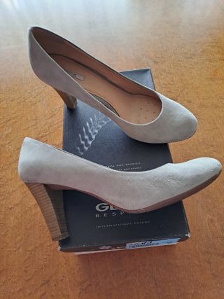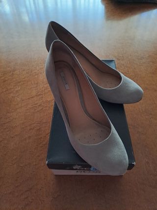 Elegantes zapatos de tacón de ante en un bonito tono gris perla. El diseño es clásico y versátil. - Material exterior de ante. - Tacón de madera con un diseño moderno. - Interior con detalles de la marca Geox.
