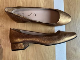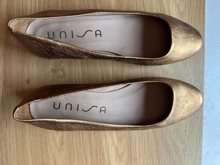 Elegantes zapatos planos de la marca UNISA en un bonito tono dorado. - Diseño de punta redonda. - Acabado metálico. - Logo de la marca en la plantilla.