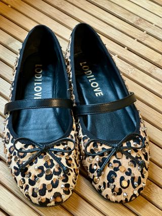 Elegantes bailarinas de la marca Lodilove. - Diseño con estampado de leopardo. - Adornadas con tachuelas plateadas. - Detalle de lazo negro en la puntera. - Tira de sujeción en el empeine. Puestas solo una vez