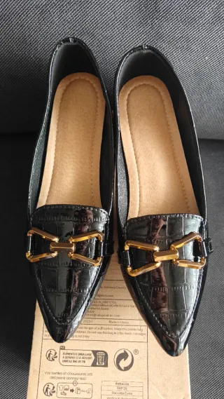 Elegantes zapatos planos con un diseño moderno y sofisticado. - Acabado brillante tipo cocodrilo. - Detalle de cadena dorada en la pala. - Punta fina. - Talla 38