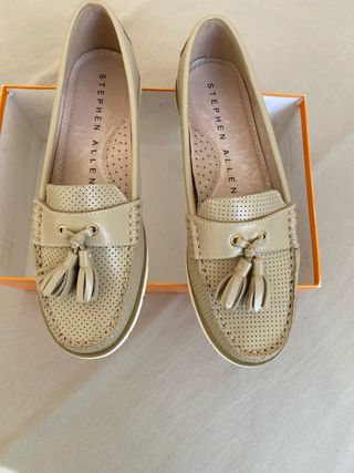 Elegantes zapatos STEPHEN ALLEN en tono beige con detalles dorados. - Diseño con perforaciones. - Adorno de flecos en la pala. - Suela de goma.