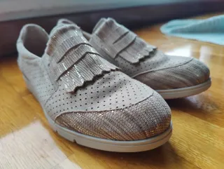 Mocasines plateados a estrenar con suela gruesa. Modernos. Elegantes. - Diseño tipo mocasín. - Acabado metalizado. - Suela de goma negra. - Plantilla técnica AIRFIT® de espuma para mayor confort. Preguntar por lotes 👏🏻
