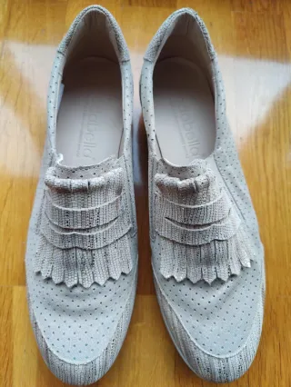 Zapatos de piel, ante impermeabilizado. Color gris con un botón plateado en el costado. Tacón muy cómodo. Marca: María Jaén Quedan fenomenal tanto con falda como con pantalón.