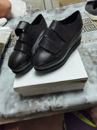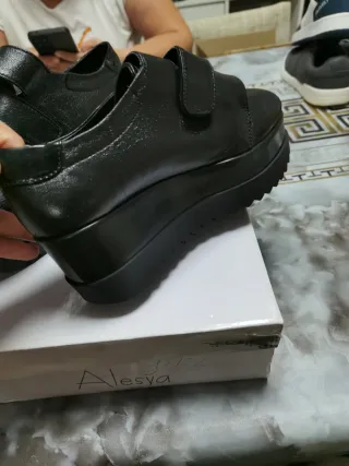 Elegantes zapatos negros de la marca Alesya. - Cierre de velcro. - Plataforma. - Diseño moderno.