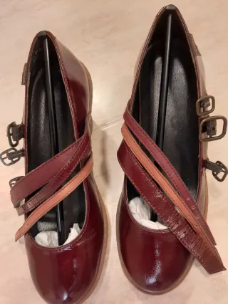 Zapatos de charol en color granate de la marca Camper. - Diseño con tiras cruzadas. - Cierre con hebilla. - Acabado brillante.