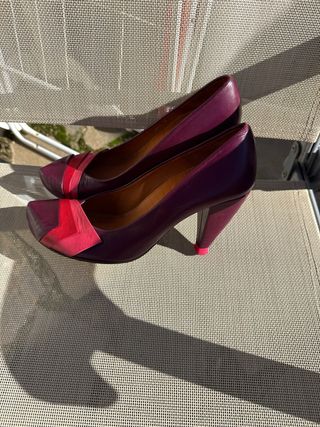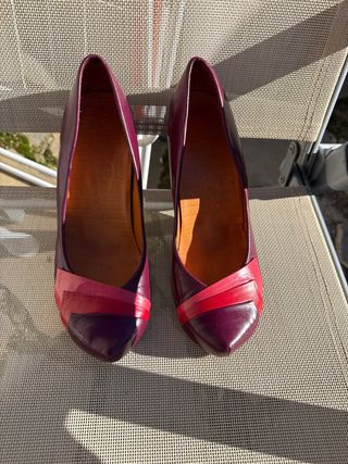 Zapatos de tacón Chie Mihara – Mujer – Talla 38 – Ciruela & Fucsia Zapatos de tacón de Chie Mihara, marca española de alta gama famosa por su comodidad y diseño exclusivo. Color ciruela intenso con detalles en fucsia suave, muy bonito y elegante. Ideales para un look sofisticado en trabajo o ocasiones especiales. Tacón cómodo y estable + plantilla acolchada para un confort extra. Piel auténtica, calidad increíble. 📏 Talla: 38 🎨 Color: Ciruela + Fucsia 📍 Estado: Bueno (suela con señales de uso) 🧵 Material: Piel ✨ Estilo: Elegante / Chic 💬 ¡No te los pierdas! Acepto ofertas razonables.