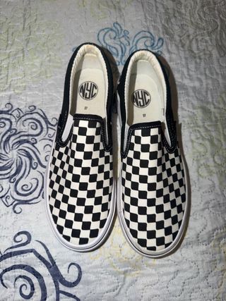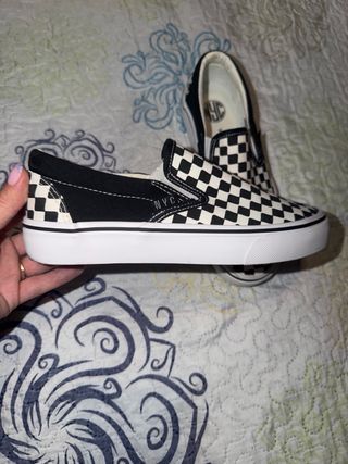 Zapatos estilo slip-on con un diseño clásico de cuadros en blanco y negro.