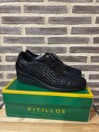 Zapatos de la marca Pitillos con un diseño llamativo. - Estampado de leopardo en negro. - Detalle brillante en el talón. - Cierre con cordones. - Suela de cuña.