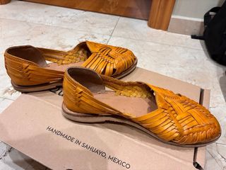 Sandalias huaraches de piel con diseño tejido. - Color naranja/amarillo. - Talla 38 - Hechas en Sahuayo.