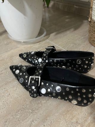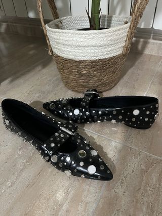 Elegantes zapatos planos negros adornados con tachuelas plateadas y un detalle de hebilla. - Diseño con punta afilada. - Tachuelas metálicas de diferentes tamaños. - Correa con hebilla ajustable.