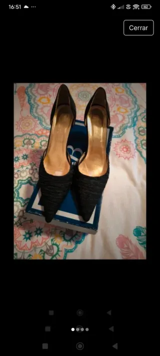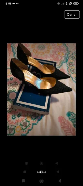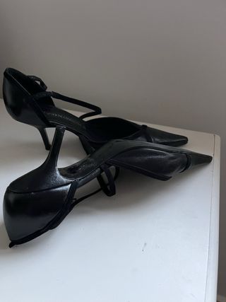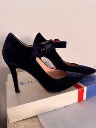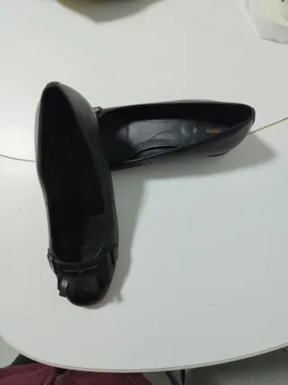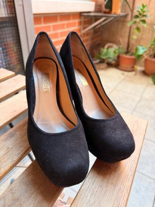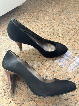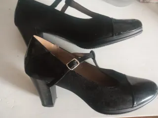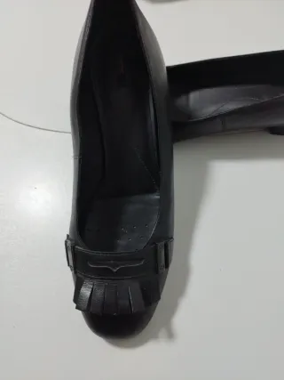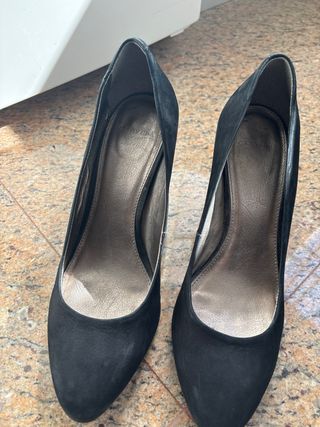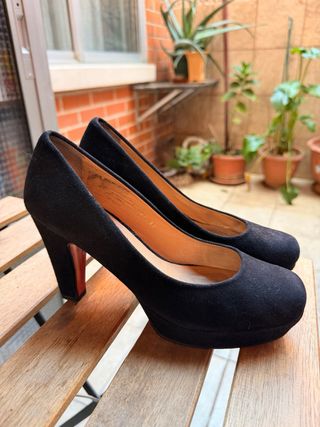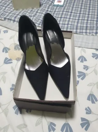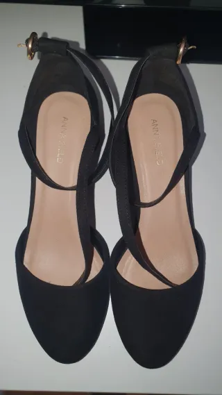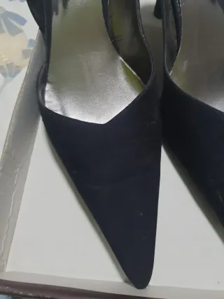 Vendo estos zapatos de tacón negros en talla 37, con plantilla interior de piel (Leather Insole). Son elegantes y cómodos, perfectos para eventos, cenas o looks más arreglados. ⭐ Estado: • En buen estado general. • Suela con señales normales de uso. • Exterior en antelina/terciopelo negro, limpio (aunque tiene algunas pelusitas propias del material). • Tacón firme y estable. 📏 Medidas: • Tacón: aprox. 10 cm • Plataforma: ligera, aprox. 1,5 cm 🎯 Detalles: • Color negro clásico, combinable con todo. • Estilo salón con puntera redondeada. • Interior cómodo gracias a la plantilla de piel.