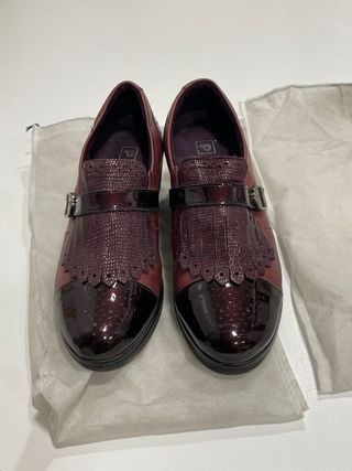 Elegantes zapatos de charol en tono burdeos. Solo han sido usados una vez. - Diseño de punta fina. - Detalle de hebilla metálica. - Costuras decorativas. - de piel. - suela de cuero. - tapas perfectas. si quieres un zapato elegante, de gran calidad y original ... este es tu zapato. un fondo de armario del color de moda y calidad excepcional. no te arrepentirás.