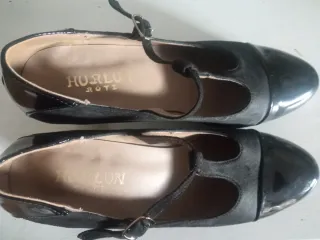 Elegantes zapatos de la marca HURLUN. - Diseño en negro - Cierre de tira con hebilla. - Punta reforzada en charol.