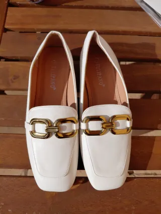 Elegantes zapatos planos de la marca Tulipano en color blanco. Perfectos para cualquier ocasión. - Detalle de hebilla dorada en la pala. - Diseño de punta cuadrada. - Suela cómoda.