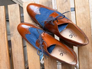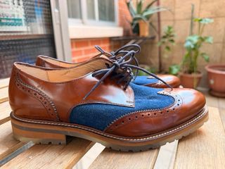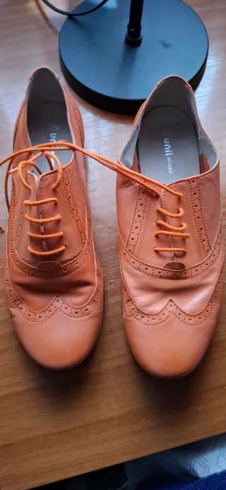 Vendo estos zapatos originales de la marca Umber, ya descatalogada. Son modelos artesanales hechos en España, difíciles de encontrar hoy en día. Están en estado impecable, usados solo una vez. ✔️ Exterior en piel auténtica color coñac, con acabado brillante y detalles brogue. ✔️ Panel central en tejido denim azul, muy resistente y con un estilo único. ✔️ Interior forrado en piel, muy cómodo y transpirable. ✔️ Suela de goma dentada, ligera y con muy buen agarre. ✔️ Cosidos con doble vira decorativa, estilo casual-elegante. ✔️ Talla: 38 Los vendo porque no les doy uso.