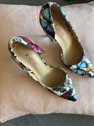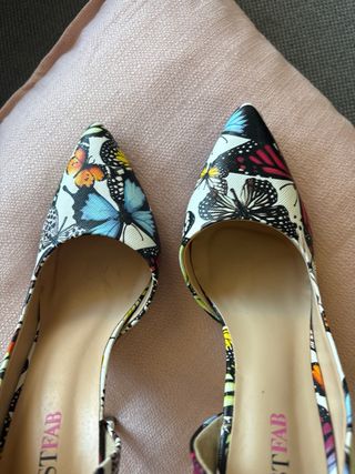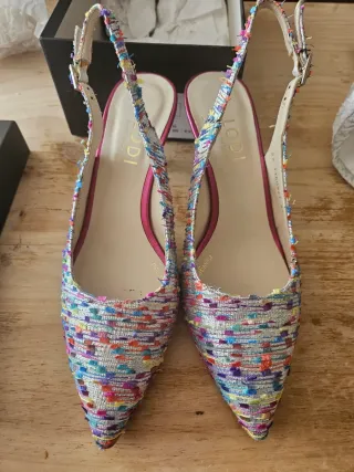 Elegantes zapatos de tacón Lodi, a estrenar, perfectos para añadir un toque de color a tu look. Diseñados con un tejido vibrante y un acabado sofisticado. Tacón de 8 cm. - Tacón fino y elegante. - Diseño destalonado con tira ajustable. - Punta afilada.