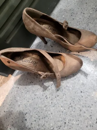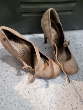 Elegantes zapatos de tacón Mustang en tonos beige y marrón. Perfectos para añadir un toque sofisticado a tu atuendo. - Diseño de tira al tobillo con hebilla. - Tacón de aguja. - Material tipo ante.