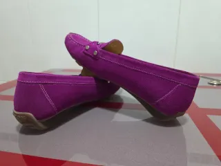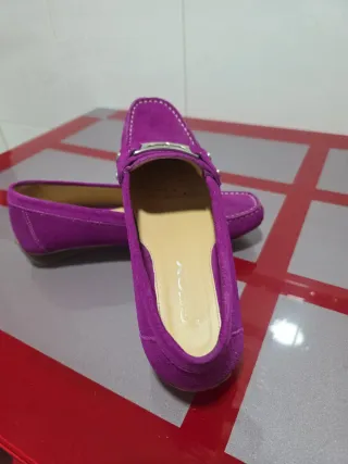 Elegantes mocasines de ante en color morado. - Detalle metálico en la pala. - Costuras decorativas. - Suela cómoda.
