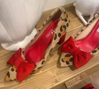 Preciosos zapatos de la marca HF Shoes con estampado de leopardo y detalle de lazo rojo. - Estampado de leopardo. - Lazo frontal de terciopelo rojo. - Acabado exterior con pelo sintético. - Bolso acolchado de color rojo de Parfois. Con dos cadenas dorada y asa larga de hombro. Nuevo.