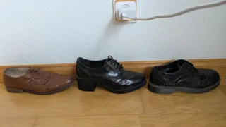 Zapatos de estilo mocasín. Los marrones están muy usados pero los negreos casi nada. Unos no tienen cordones pero se los puedes poner. Por 3 euros te llevas los 4 zapatos.