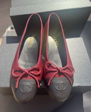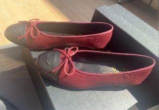 Elegantes bailarinas de la marca Chanel en color burdeos. - Diseño clásico con puntera reforzada. - Detalle de lazo en la parte delantera. - Logo de la marca grabado en la puntera. - Interior con logo de la marca.