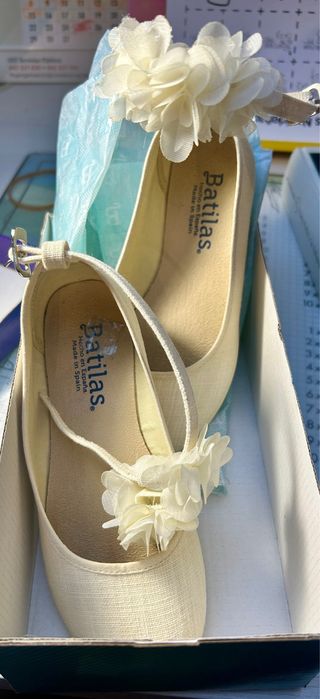 Preciosos zapatos para niña de la marca Batilas, hechos en España. Son de color beige y tienen un detalle de flor. - Cierre con tira y hebilla. - Suela cómoda. - Diseño elegante. -Talla 31