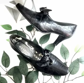 Zapatos negros de piel, número 37 de Giko. Elástico en empeine. Detalle de lazo. Tacón 5'5 cm. En perfecto estado.