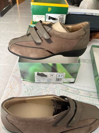 Vendo dos pares de zapatos de mujer Pitillos. Son de color marrón claro y tienen un diseño elegante y cómodo. - Un par es la talla 39, estilo deportivo. - El otro par es la talla 37, con cierre de velcro. - Ambos están nuevos, en su caja original.