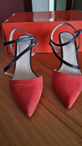 Preciosos zapatos de mujer de tacón. Son de color rojo y negro, una combinación elegante y moderna. - Diseño de tiras cruzadas en color negro. - Tacón fino. - Material de ante rojo.