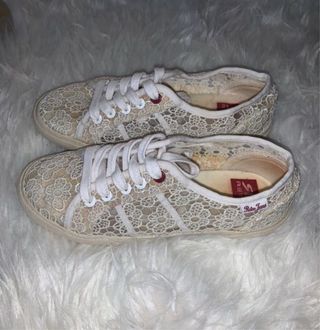 Zapatos de la marca Retro Jeans con un diseño delicado de encaje. - Color beige y blanco. - Talla 37. - Cierre con cordones blancos. - Detalle de tres líneas en los laterales.