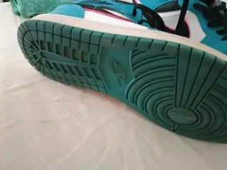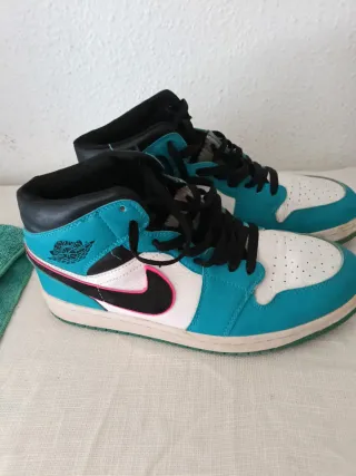 Zapatos deportivos Nike en buen estado, con un diseño llamativo en tonos turquesa y rosa. - Suela de goma con buen agarre. - Detalle de logo de la marca en la suela.