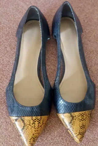 Elegantes bailarinas de la marca Parfois. - Diseño con punta afilada. - Combinación de azul y amarillo. - Detalle de estampado de serpiente en la puntera.
