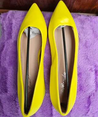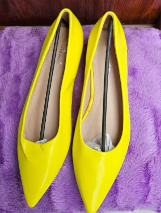 Elegantes zapatos planos de charol en color amarillo brillante. El diseño de punta fina los hace muy modernos. - Talla: 39 (aunque la etiqueta indica 40, calzan como un 39). - Material: Charol. - Color: Amarillo.