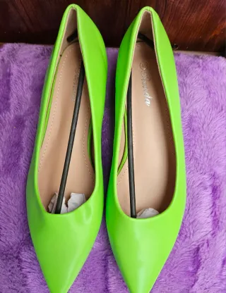 Zapatos planos de punta en color verde brillante. - Talla 40 (aunque pueden tallar algo menos). - Diseño elegante y moderno.