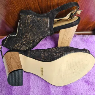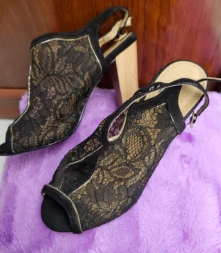 Elegantes zapatos de tacón con un diseño de encaje que combina negro y detalles dorados. La talla indicada es 40, pero se recomienda probarlos ya que pueden tallar algo más pequeño. - Tacón de bloque de madera. - Cierre de tira ajustable al tobillo. - Punta abierta.