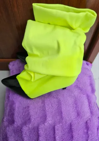 Botas de caña alta con punta afilada y acabado brillante en la puntera. - Color neón vibrante. - Puntera negra brillante. - Talla 40 (ajustado para quien usa 39).