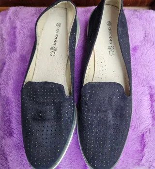 Zapatos planos de ante azul con microperforaciones. - Marca: Goodin - Talla: 39 - Material: Vera Pelle (piel auténtica) - Diseño elegante y cómodo