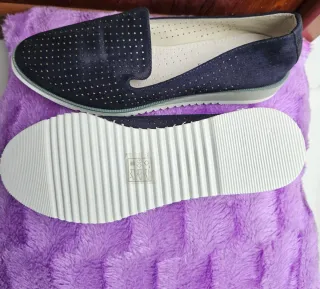 Vendo un par de zapatos gris tipo mocasín. Son de ante y tienen una suela de color crema. Están en perfecto estado, sin usar. -Piel de ante. -Suela crema.