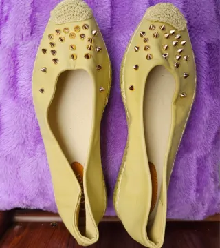 Zapatos planos de estilo espadrille con un toque moderno. - Diseño en color dorado y amarillo. - Adornados con tachuelas metálicas. - Detalle de esparto en la puntera. - Talla 40.