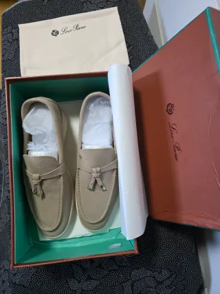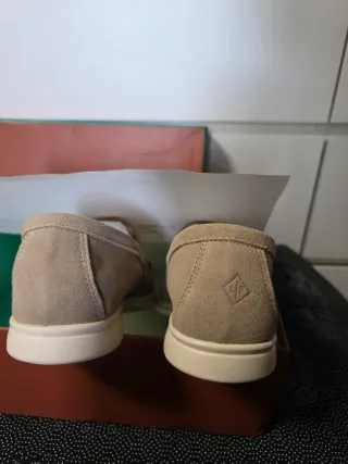 Elegantes zapatos de la marca Loro Piana en color beige. - Diseño de mocasín. - Detalle de lazo con flecos en la pala. - Material de ante.