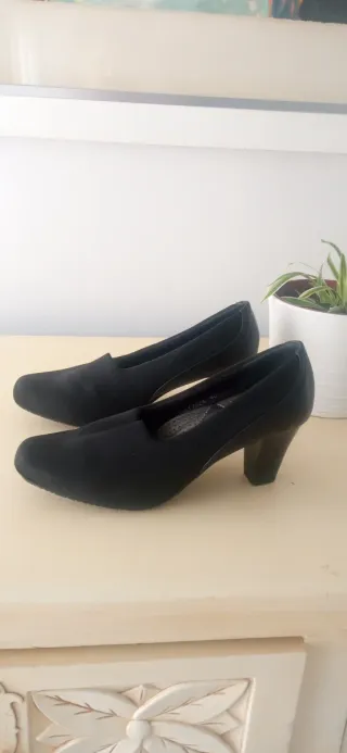 Elegantes zapatos de tacón en color negro. - Diseño clásico y versátil. - Tacón grueso para mayor comodidad. - Material exterior de tela q se adapta a tu empeine. - Talón reforzado en piel. - Plantilla de piel acolchada. - MÁXIMA COMODIDAD. - Puestos en una ocasión. Hago envíos y entrego en persona.