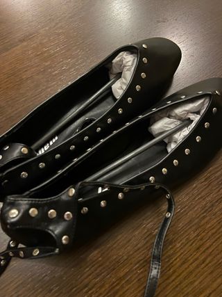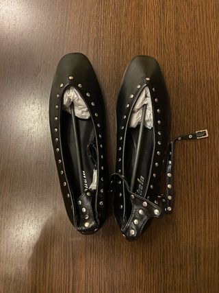 Elegantes bailarinas negras con un diseño moderno. - Detalle de tachuelas plateadas alrededor. - Acabado liso y puntera fina. - Tira fina para atar al tobillo.