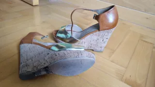 Elegantes cuñas para mujer con un diseño moderno. En buen estado aunque con alguna marca de uso como se ve en fotos - Combinación de piel marrón y detalles dorados. - Plataforma tipo cuña con acabado de corcho. - Correa ajustable al tobillo con hebilla.