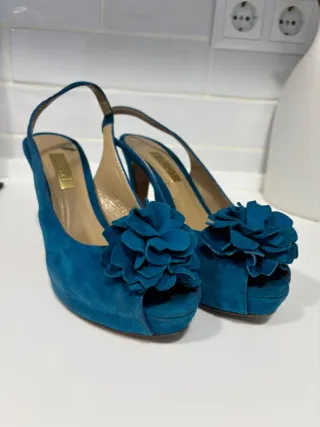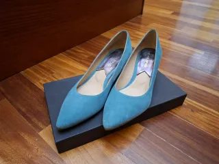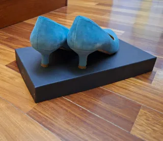 Elegantes zapatos de salón pumps de ante en un llamativo color azul turquesa. Un diseño clásico con un toque moderno. Nuevos, en su caja, con su etiqueta, sin usar. - Tacón fino y estilizado 8 cm - Punta afilada. - Detalle del logo de la marca en la plantilla, de cuero. #tacones #taconesaltos #salones #zapatostacon #taconesclásicos #taconesoriginales #salonesoriginales #saloneselegantes #taconeselegantes #pumps #invitadaperfecta #invitada #bodasbautizoscomuniones #boda #comunion