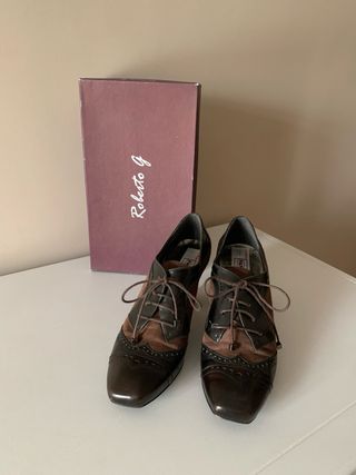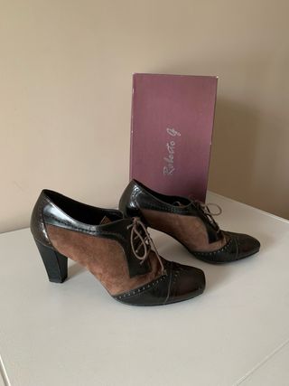 Elegantes zapatos de tacón de piel y ante, con cordones, color marrón T-39