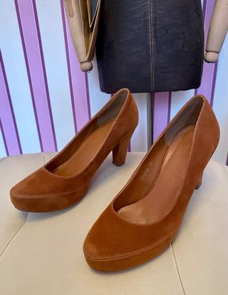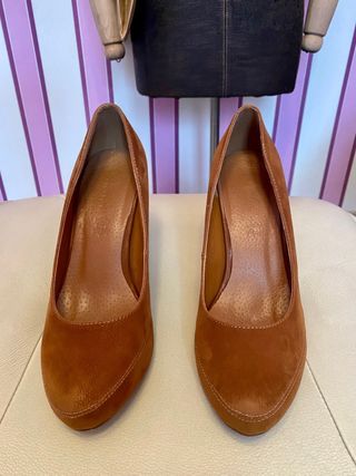 Elegantes zapatos de tacón con acabado en ante y detalles de piel. - Tacón grueso y plataforma. - Diseño de punta redonda. - Sin usar. - Precio original 89€. - Plantilla de gel.