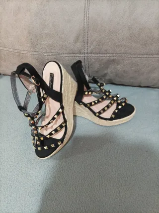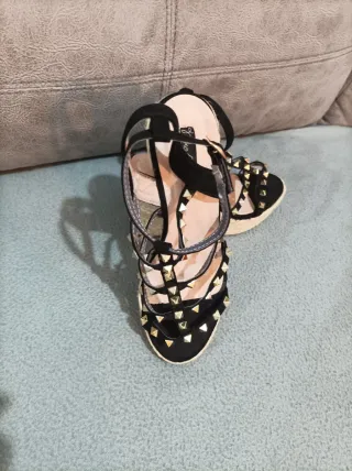 Elegantes zapatos de cuña con un diseño atrevido. - Tiras negras con tachuelas doradas. - Cierre de hebilla. - Suela de esparto. No envío