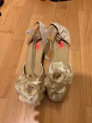 Zapatos de baile de la marca Reina, ideales para bailes de salón. - Color dorado. - Fabricados en España. - Detalle de pedrería en la pala. - Cierre con pulsera al tobillo. - Hechos a mano. - Casi 9 cm de tacón. - Nuevos sin estrenar.
