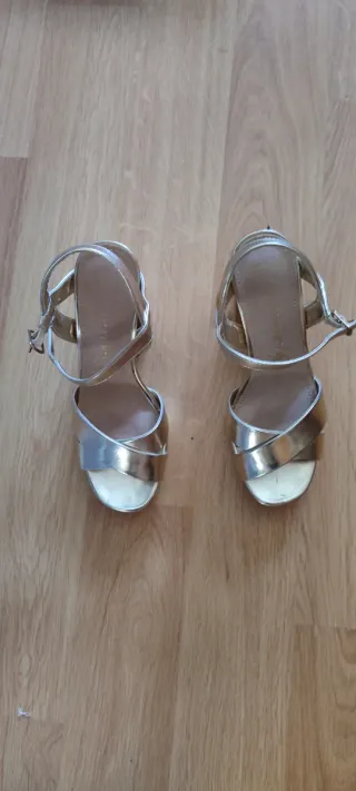 Elegantes zapatos de tacón de la marca Primark en color dorado. - Diseño cruzado en la parte delantera. - Correa ajustable al tobillo con hebilla.